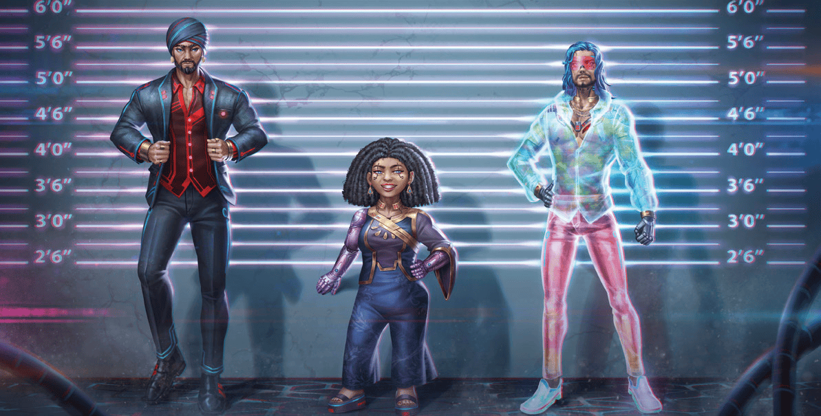 Crafted from static-free, tear-proof synthetic silk, the Corporate Island line slides right over cyberware and concealed weapons. So, while the other guy is looking like a stiff, you can flex all you want and not worry about having to replace your beautiful outfit!