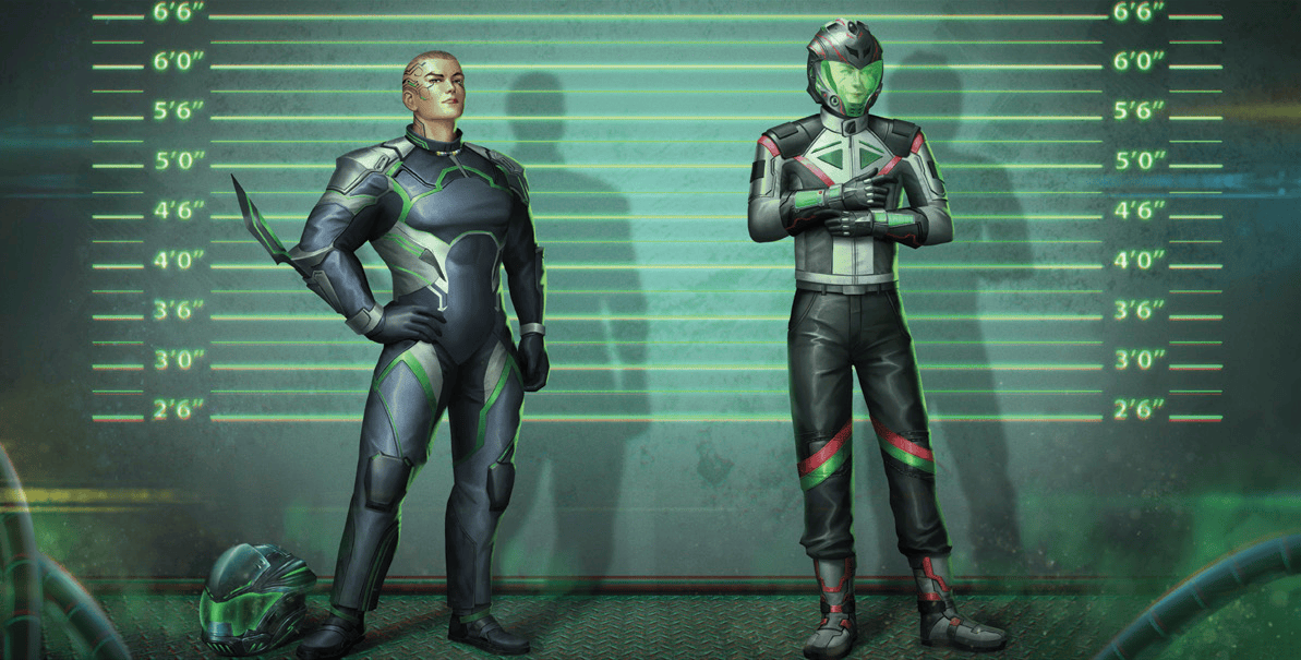 Mechanics: The MechaMan Motorcycle Helmet is Flak Head Armor with built-in Tech upgraded Smart Glasses, which come installed with Chyron and Low Light / Infrared / UV Cybereye options.
