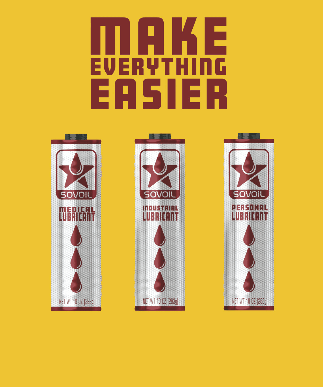 SovOil sells a number of petroleum-based lubricants for various purposes. Their three most popular provide lubrication for medical uses such as first aid on burns and scrapes, personal use to ease sexual intercourse, and industrial uses such as loosening nuts and bolts and quieting squeaking hinges. For obscure reasons, all SovOil lubricant products are packaged in identical cans with similar design so be sure to read the label before use.