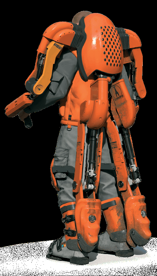 Zhirafa’s EL-F4-NT is a linear frame designed for use by anyone and not just those already wired up. Instead of using Interface Plugs for operation, manual controls line the forearm and thigh sections of the suit, giving the frame a unique construction equipment silhouette. It is not much larger than a typical human, with hydraulic arms and leg supports, but it is capable of lifting cargo crates and moving them around as if the user were a walking forklift.
