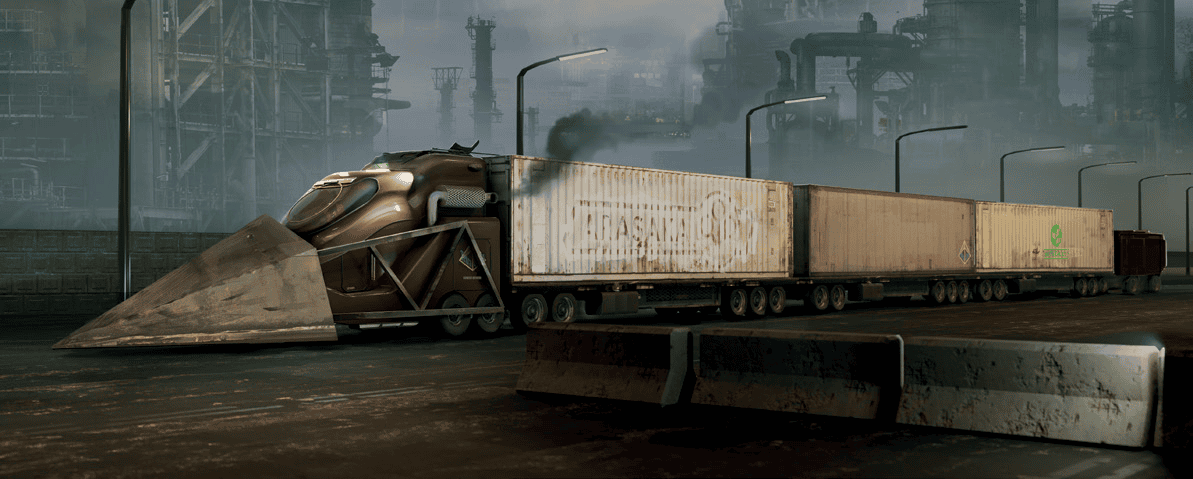 Inside the heavily armored cab, the MegaHauler is state-of-the-art, with optical sensors in the dashboard watching the driver and activating the radio if a drooping eyelid is detected. A full suite of communication tools stud the console, ready to connect the trucker to nearby backup in case of road pirates.
