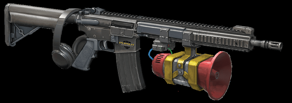 The Pursuit Security Incorporated Crowd Buster is the leading weapon for crowd control. This assault rifle is equipped with a built-in shrieker, making it great for dispersing large, unruly mobs. The shrieker is located below the rifle barrel and is powered by a standard 50eb eight-shot rechargeable battery pack. Each Crowd Buster comes with a pair of Auto Level Dampening Ear Protectors to protect the user from the ear-damaging effects of firing the shrieker.