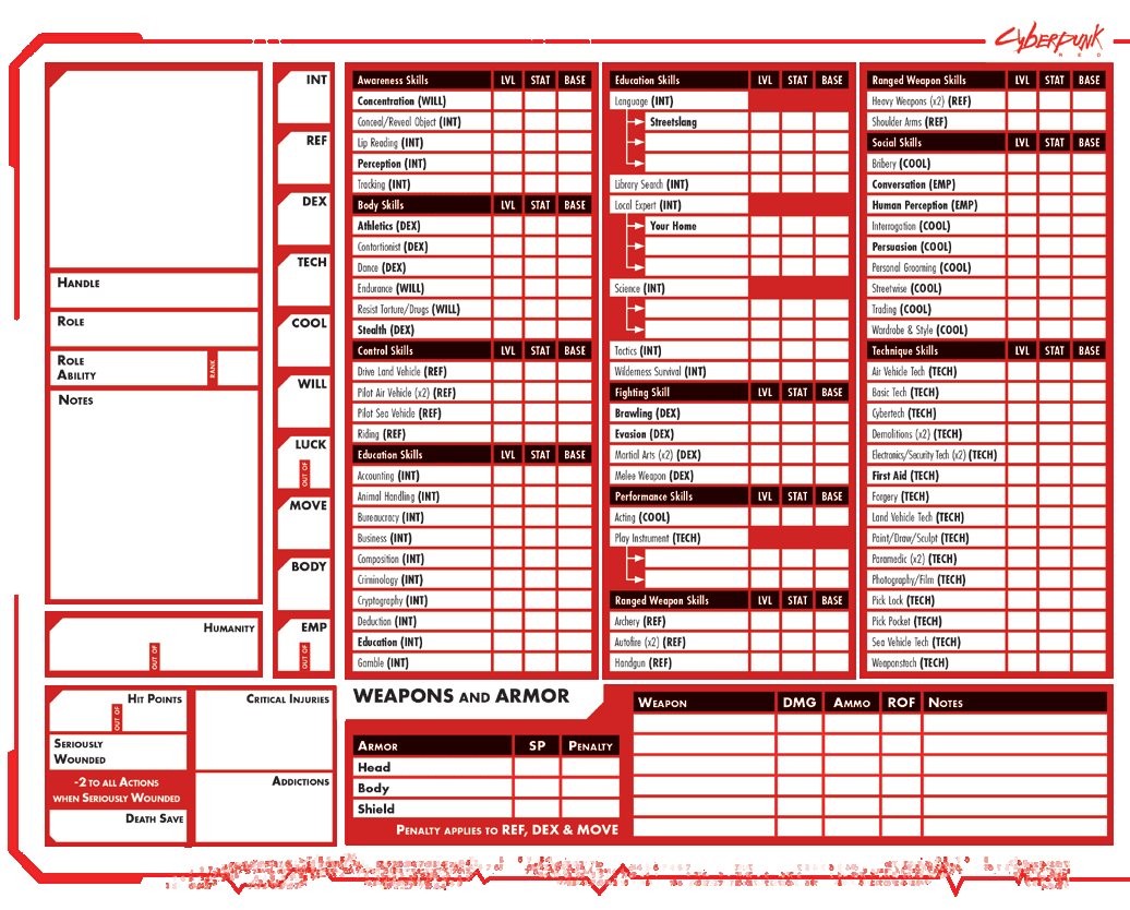This guide explains how to use the Cyberpunk RED character sheet β what each field means, how to fill it in, and how to keep it updated during play.